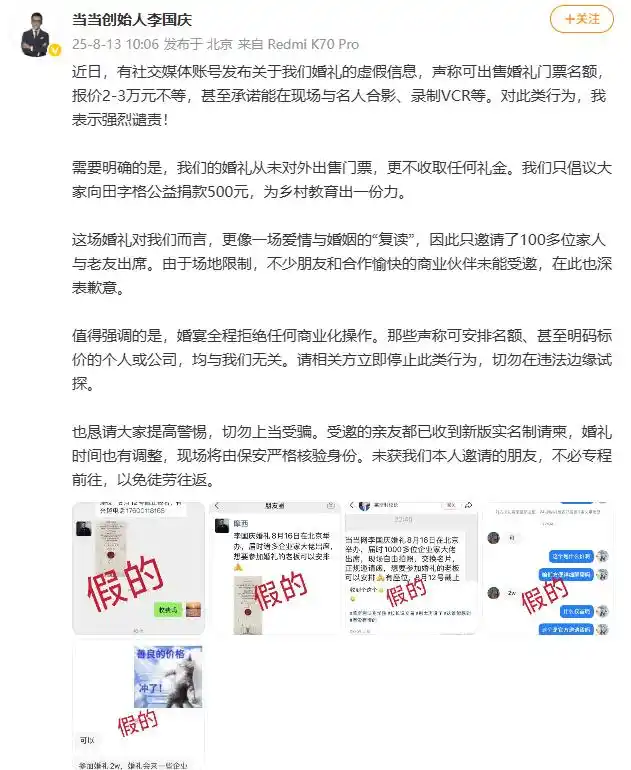 8月13日,当当网创始人李国庆在个人社交账号发文,确认再婚消息,对部分社交媒体账号发布的关于其婚礼的虚假信息辟谣,坚决否认 “出售婚礼门票、报价2到3万” 等说法。