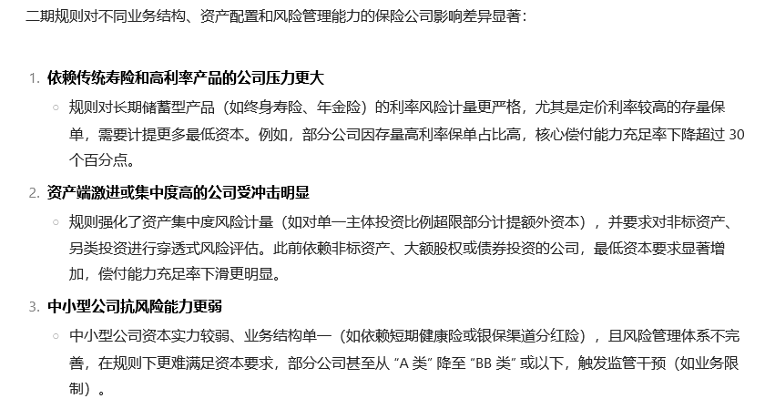 并且,“偿二代” 二期新规实施后,监管对保险公司资本要求更高。中小保险公司因规模小、资金实力有限,更容易出现偿付能力不达标情况。