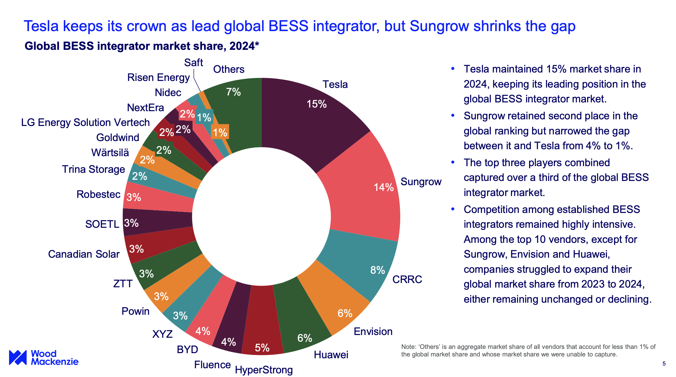 全球老大的位置仍被特斯拉占领,其已连续两年夺得该宝座。伍德麦肯兹指出,2024年,特斯拉保持了15%的市场份额,紧随其后的阳光电源,与前者的差距也在逐步缩小,已从上年的4%收窄至1%。
