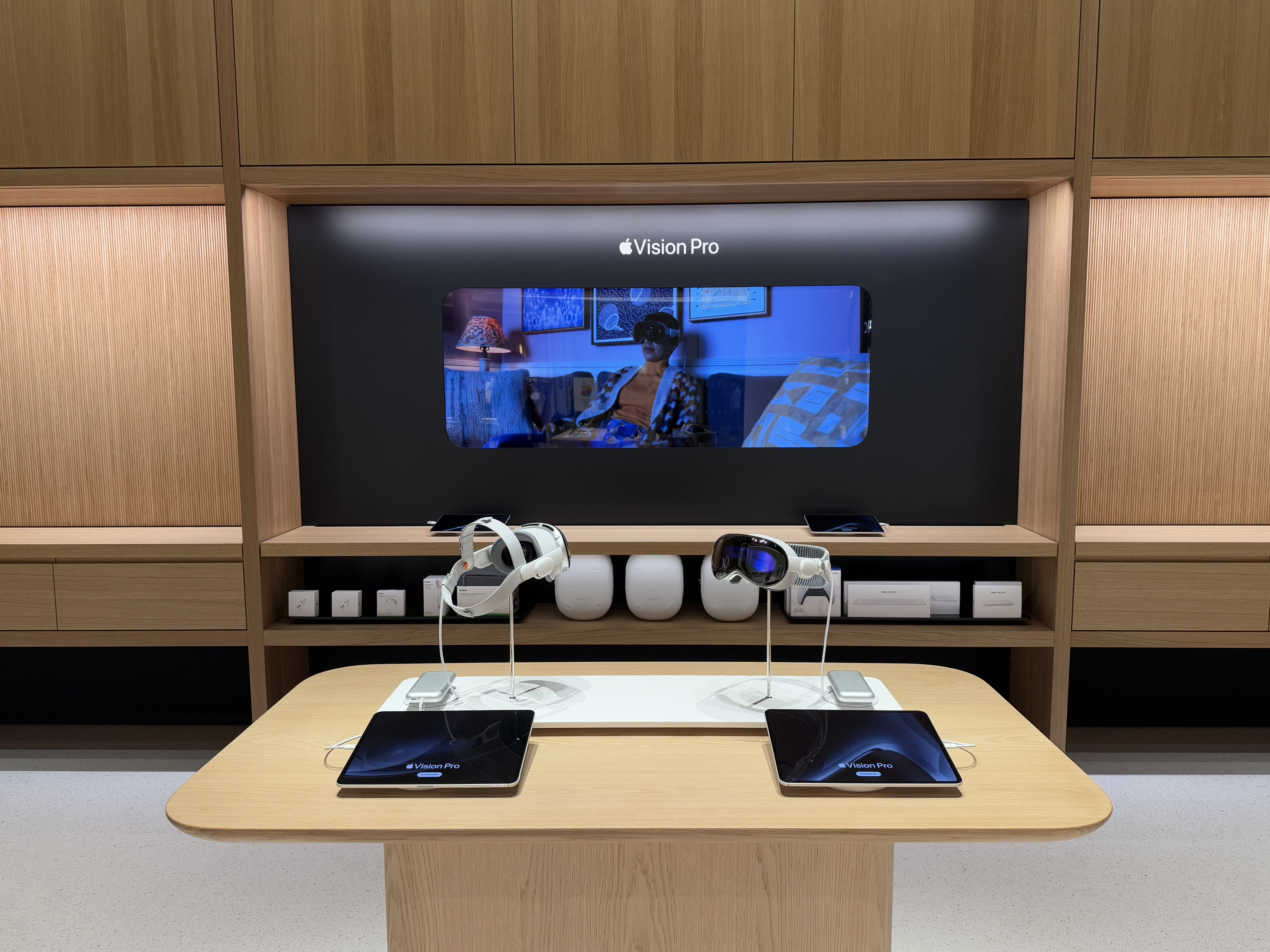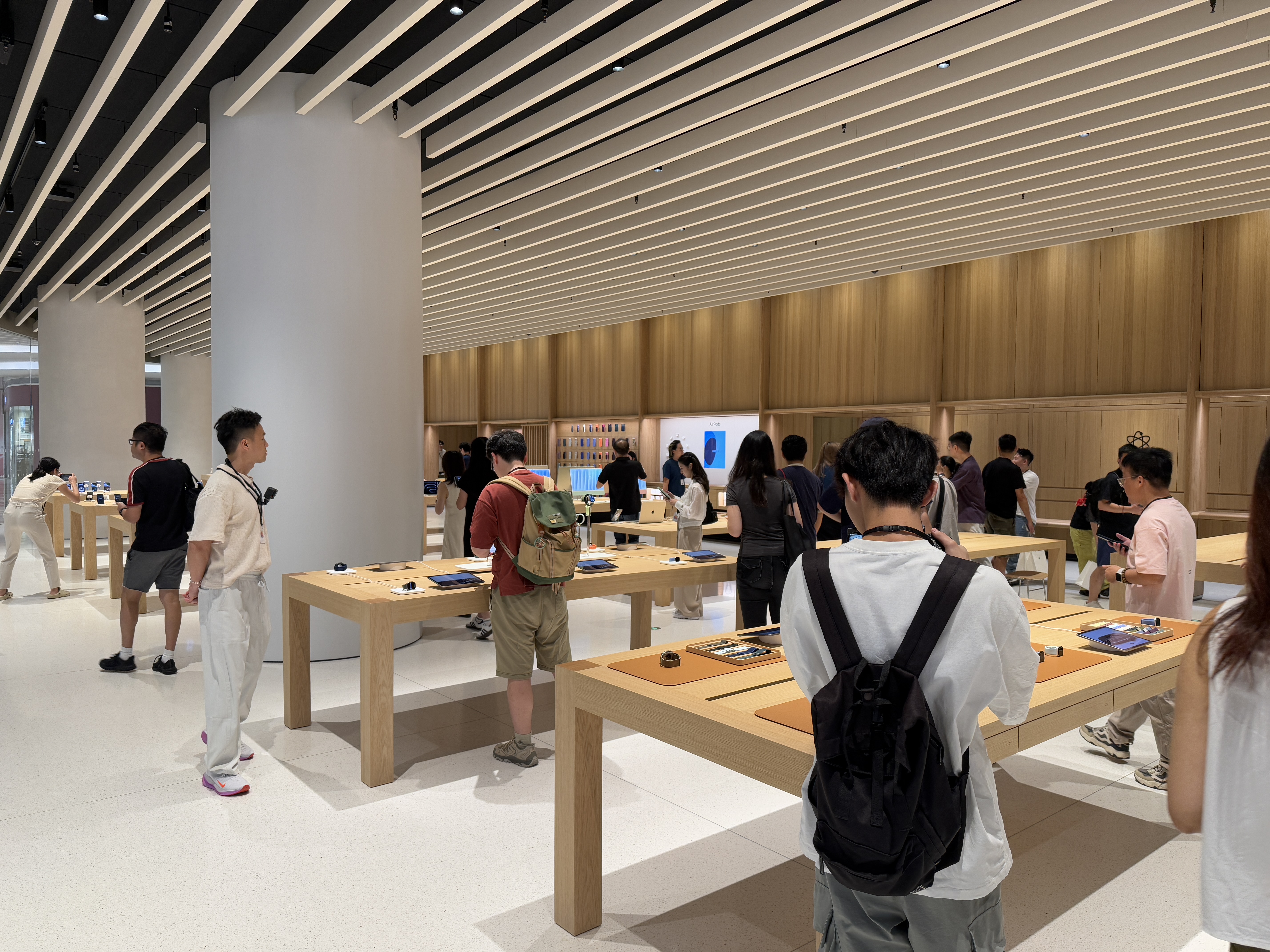 从体感上而言,这不算是苹果在大中华区设计和面积最为突出的一家门店。除了几乎标配的Pick up取货台,Genius Bar天才吧,店内布局相对紧凑,共设有11张产品展示桌,其中4张属于iPhone,iPad和MacBook分别设有2张,其余包括iMac、Apple Watch等,另有一处Apple Vision Pro的专属空间。