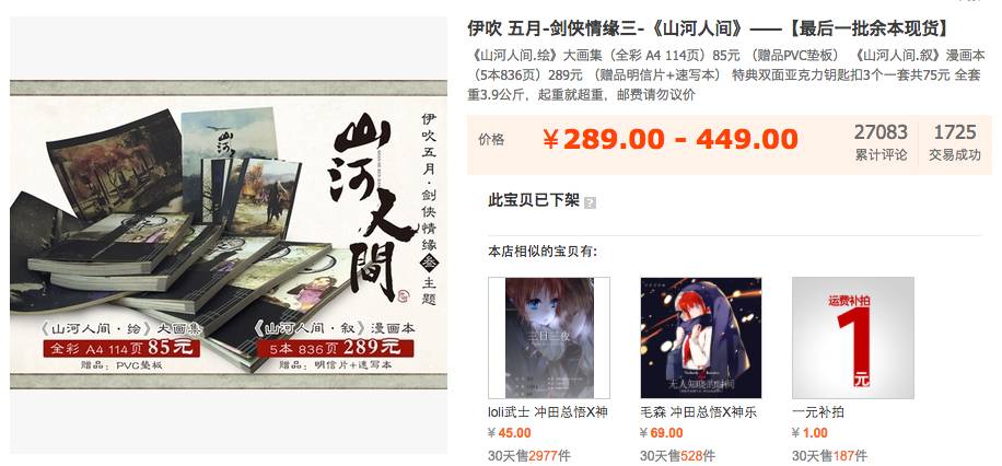 她的同人作品集《山河人间》,根据商品组合的不同定价在289元至449元之间,而淘宝页面上的有效评价超过2.7万条,据此粗略计算一下收入达到800万以上。不过共6本近千页的内容量,加上其他赠送的周边,成本应该也不低,利润不便计算。伊吹五月此前的同人作品集《心战》、《乱生春华》等,其销量也基本都超过了1万册,这已经达到了正规出版画集的销量。不过伊吹五月推出同人画集的频率并不高,通常在一年甚至更久才推出一本。