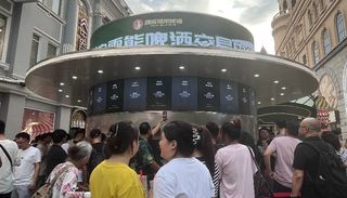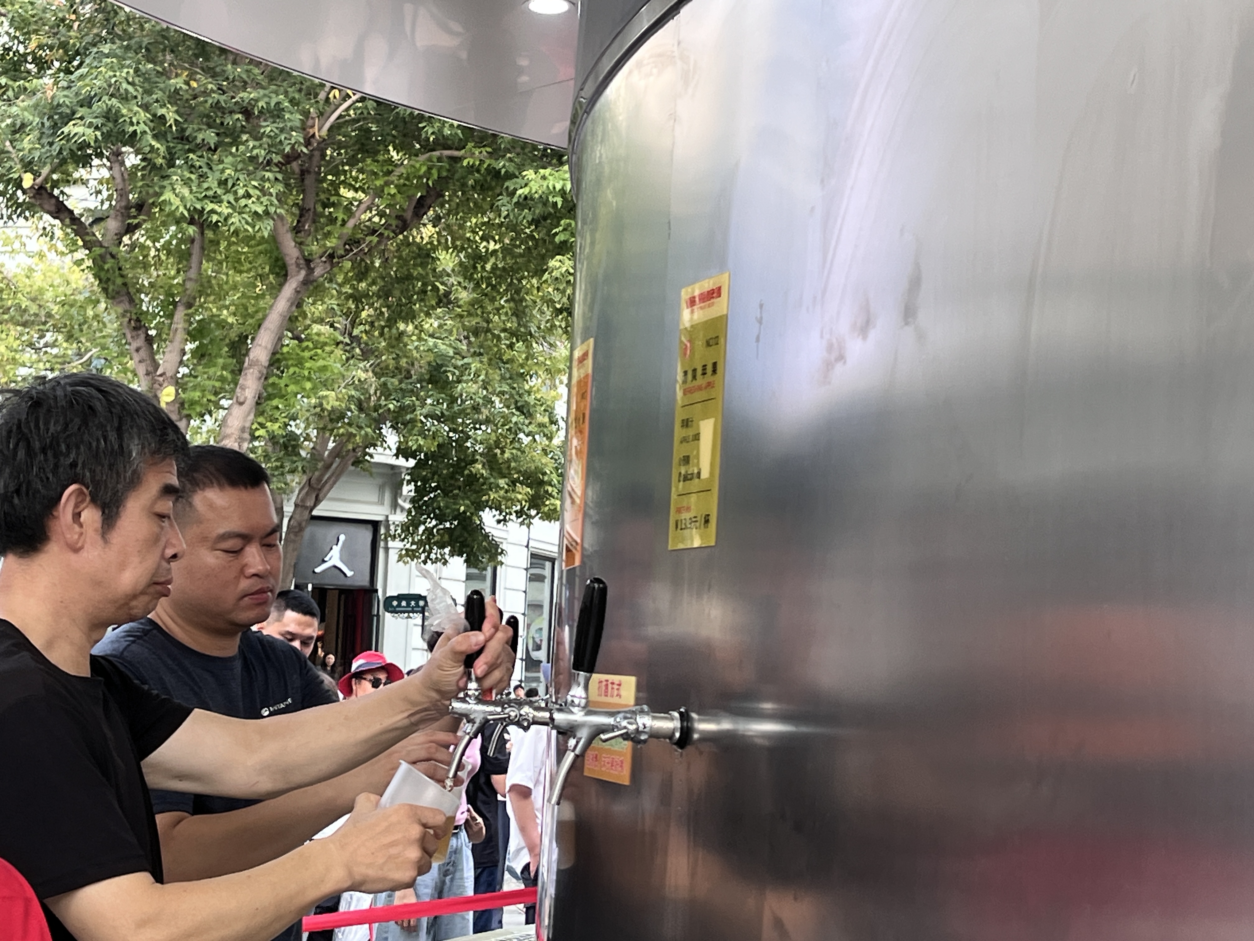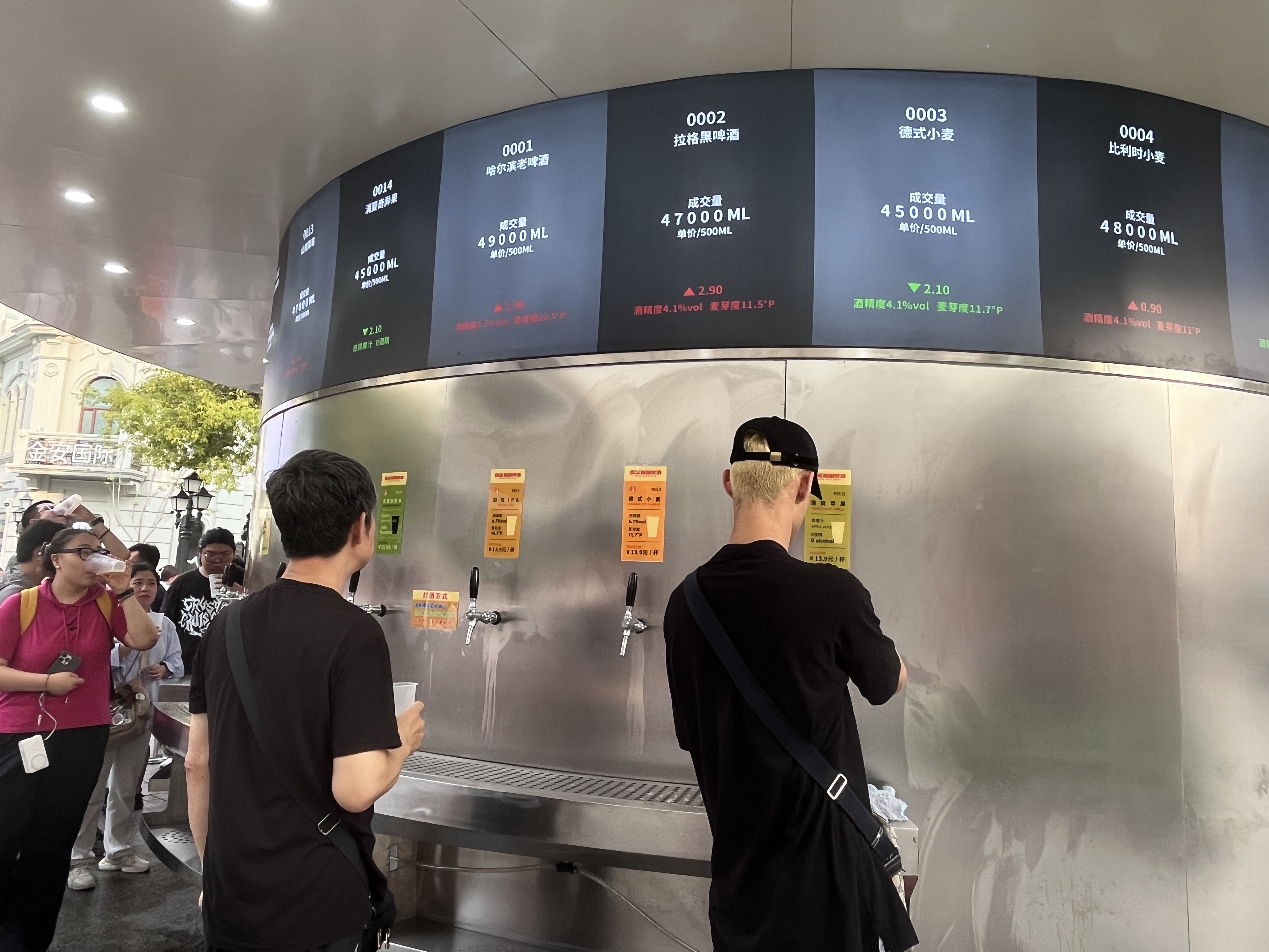 这股热潮的背后,是雪熊啤酒精心设计的“亲民策略”。雪熊啤酒交易中心8月7日开始营业,这座巨型啤酒装置日均售出超2000杯,销售额约2至3万元。15种特色风味啤酒,从龙井绿茶、百香果、海盐荔枝到IPA精酿,满足着不同口味的需求。游客只需扫码付费,即可领取一个空杯,在琳琅满目的酒头前自由选择、按需接取。