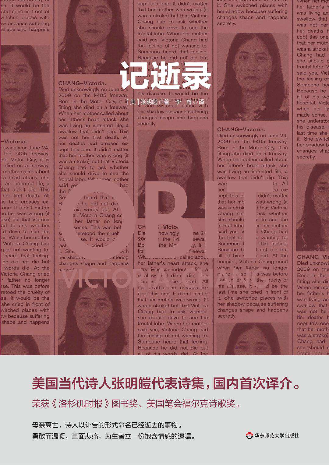 在母亲离世、父亲中风之后,张明皚开始关注身边随着至亲消逝而渐渐消亡的东西,包括让父亲失去说话功能的额叶,也包括食欲和乐观,还包括她自己。围绕着这些“死亡”的碎屑,张明皚完成了一本由70篇讣告形式之诗组成的集子,取名《记逝录》(OBIT)。她把诗句码放在一个个矩形之中,看起来像一块块落在纸页上的墓碑。她说形状的限制反而使她能更加自由地流露痛苦,不可言说的情绪也进而被语言捕捉,传递给生者。如她在诗中所言,“死者拿着我们手里的另外半张票,他们梳头发时,我们的树会沙沙作响”。