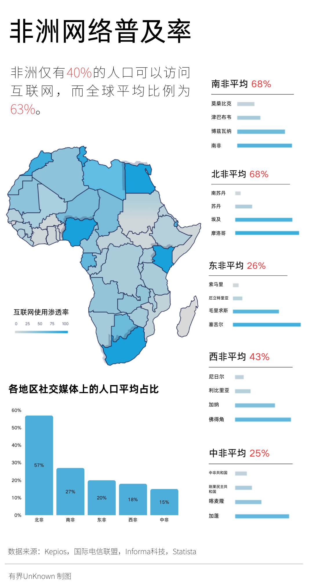 也就是说,非洲互联网不仅普及不足,而且分布还极不均匀,绝大部分非洲人都没有使用互联网的权利。