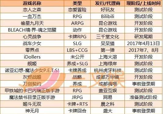 其中以CP20和萤火虫最为集中。除了我们熟知的《阴阳师》、《崩坏》系列、《少女前线》等,也不乏一些新鲜的面孔。比如最近上线的《姬斗无双》、《战车少女》,还有日漫IP改编的《魔法禁书目录》、《甲铁城的卡巴内瑞》、《BLEACH:魂之觉醒》,以及国漫IP改编的《偷星九月天》,另外还有《零界点》《心灵战争》《诺亚幻想》《神无月》等原创IP游戏。