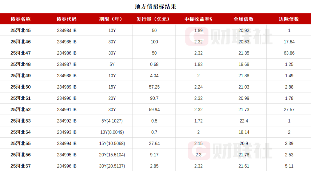 据财联社消息,河北省政府十三期地方债已招标结束,投标倍数均在18倍之上,具体中标信息如下: