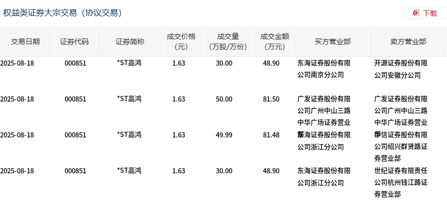 8月18日,*ST高鸿大宗交易成交159.99万股,成交额260.78万元,占当日总成交额的66.21%,成交价1.63元,较市场收盘价1.63元持平。