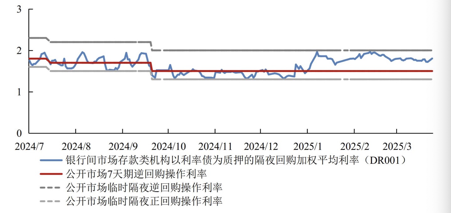 而从今年一季度开始,央行在货币政策执行报告中展示货币市场利率指标时选用DR001这一指标。在《2025年第一季度中国货币政策执行报告》中,市场基准利率选用DR001而非DR007;DR001围绕7天逆回购利率波动,上限为临时隔夜逆回购操作利率(7天逆回购利率+45bp),下限为临时隔夜正回购操作利率(7天逆回购利率-20bp)。