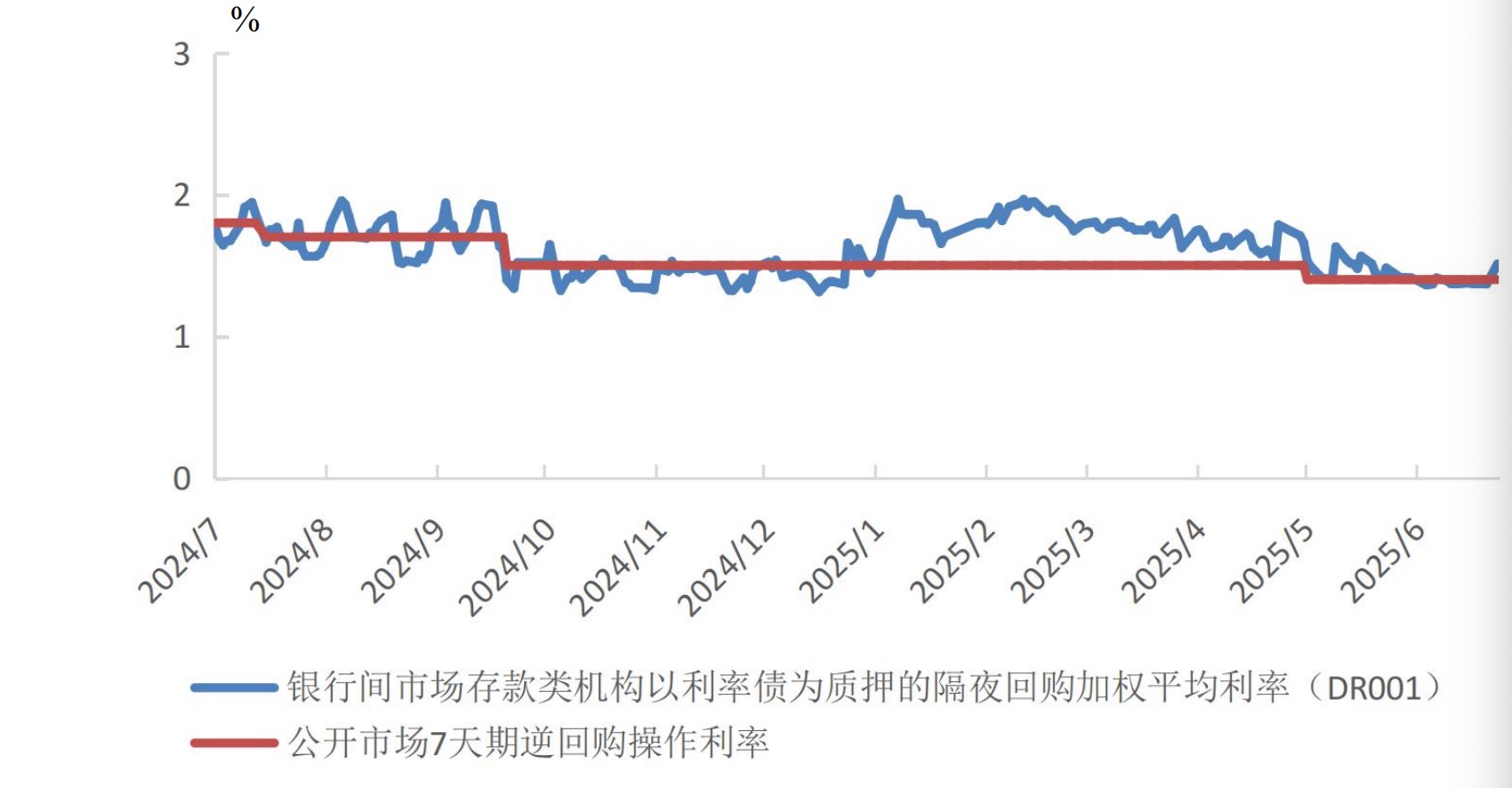 在《2025年第二季度中国货币政策执行报告》中,央行在展示货币市场利率走势时继续选用了DR001这一指标,而DR001围绕7天逆回购利率波动。