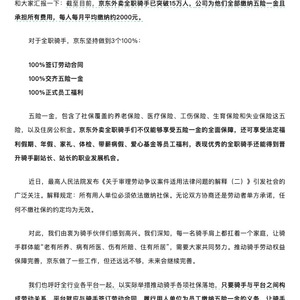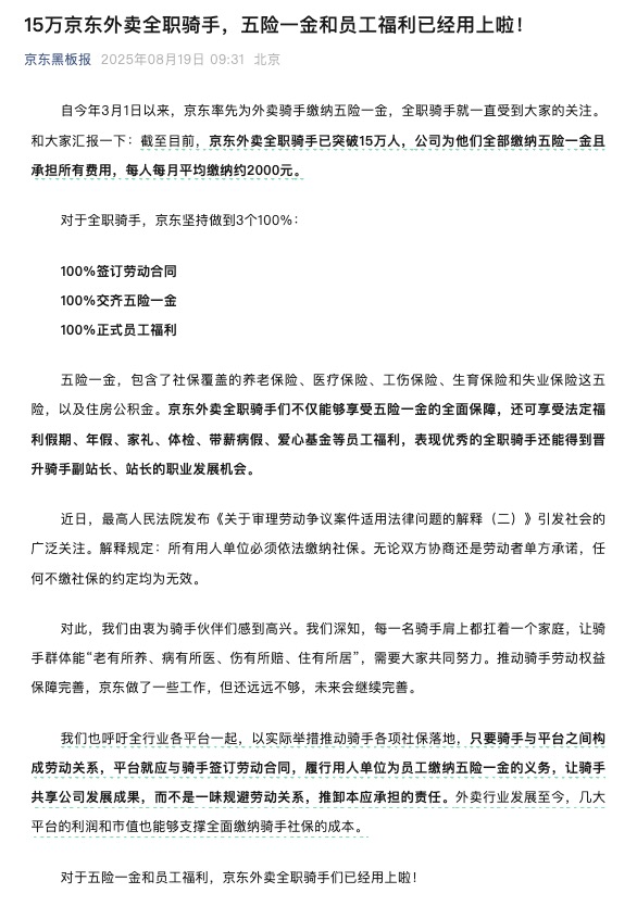 8月19日,京东宣布,截至目前,京东外卖全职骑手已突破15万人,每人每月平均缴纳五险一金约2000元;此外还可享受法定福利假期、年假、家礼、体检、带薪病假、爱心基金等员工福利,表现优秀的全职骑手还能得到晋升骑手副站长、站长的职业发展机会。京东呼吁全行业各平台一起以实际举措推动骑手各项社保落地,“只要骑手与平台之间构成劳动关系,平台就应与骑手签订劳动合同,履行用人单位为员工缴纳五险一金的义务,让骑手共享公司发展成果,而不是一味规避劳动关系,推卸本应承担的责任”。京东还称,外卖行业发展至今,几大平台的利润和市值也能够支撑全面缴纳骑手社保的成本。