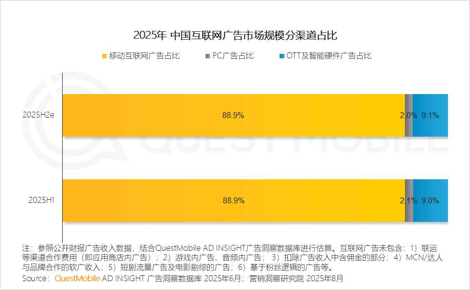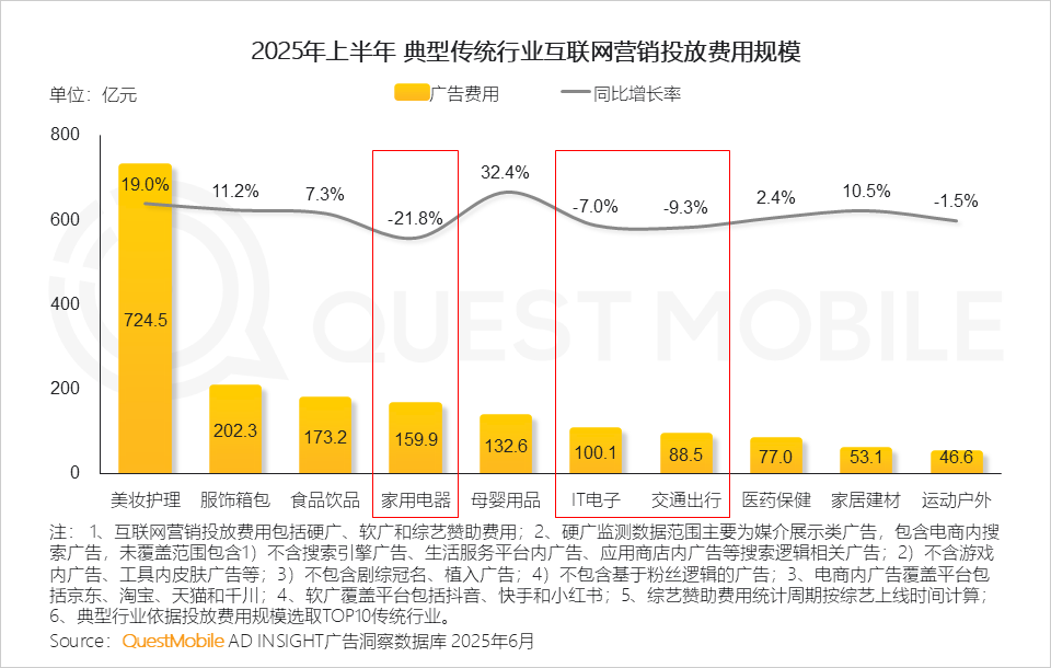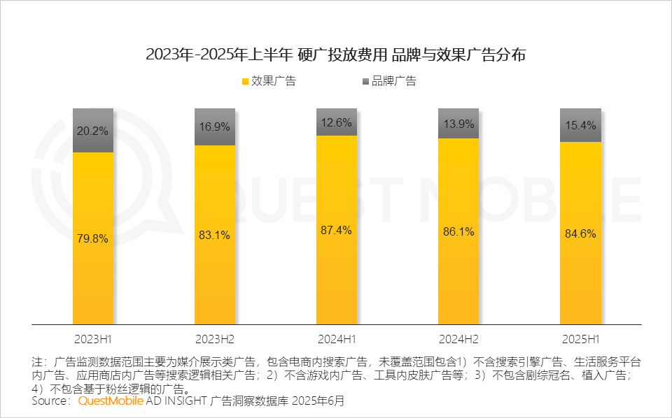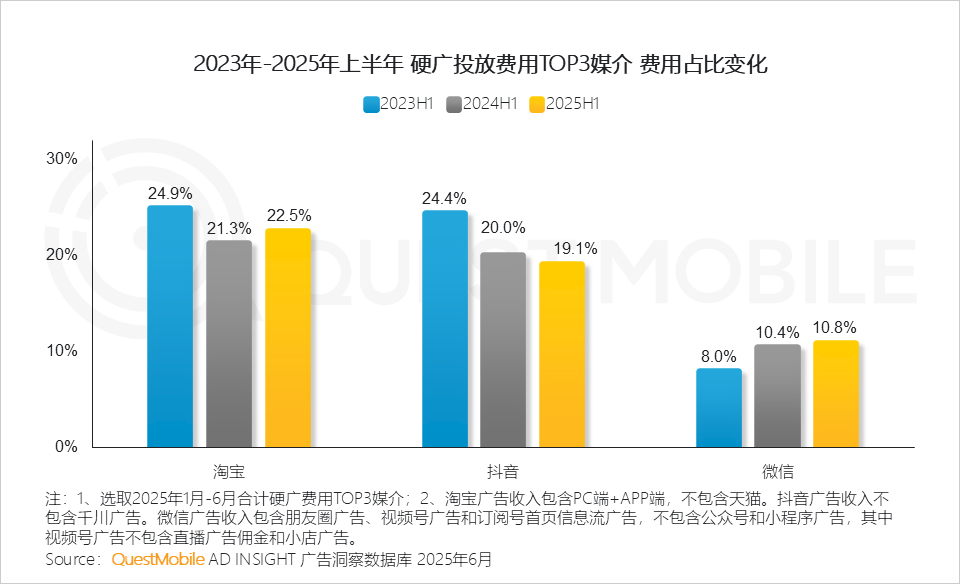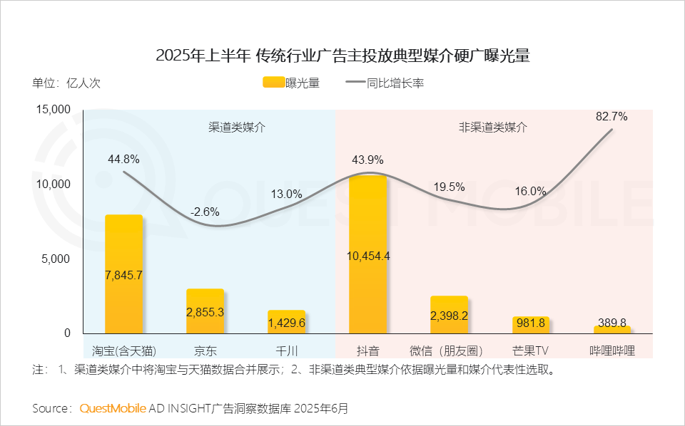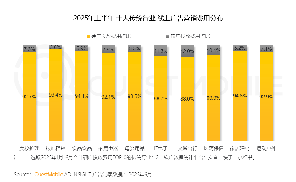 QuestMobile数据显示,2025年上半年,美妆护理、家用电器、运动户外等行业将超过50%的硬广费用投放在渠道类媒介。