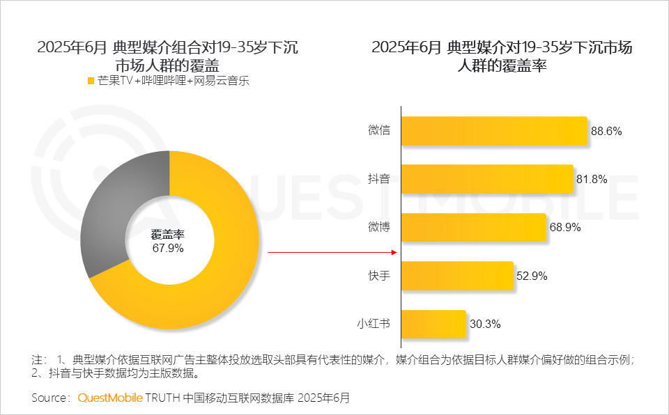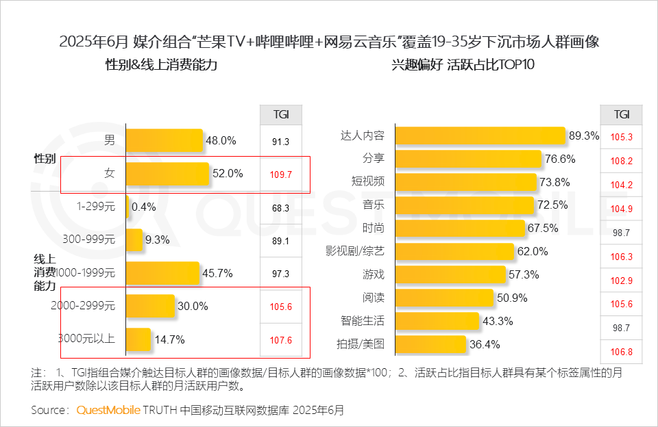 1.2 如媒介组合芒果TV+哔哩哔哩+网易云音乐,在2025年6月可触达约2/3的下沉市场年轻人群,并且该媒介组合能更好的触达下沉市场高消费能力女性人群
