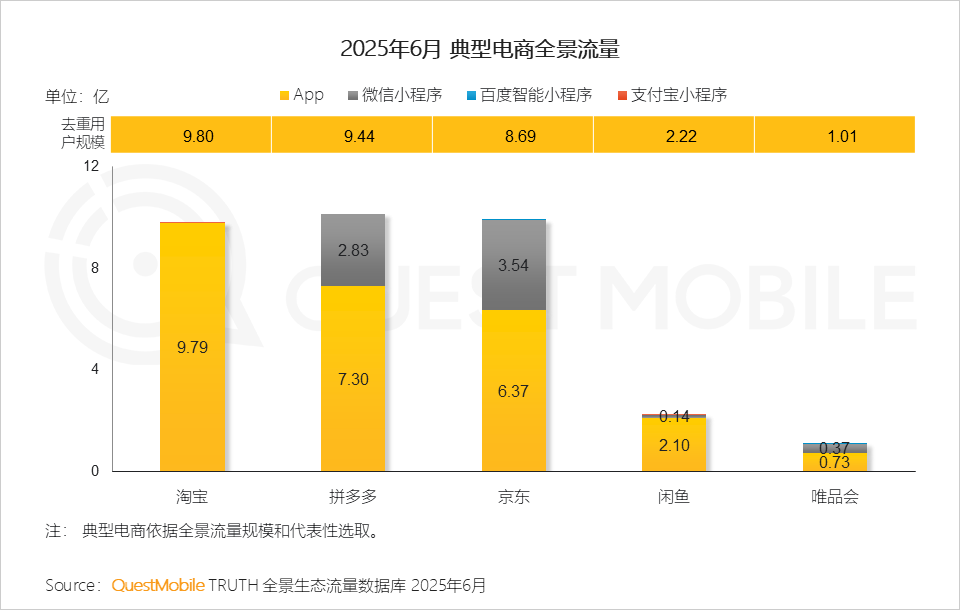 QuestMobile数据显示,2025年6月,微信小程序为拼多多和京东分别贡献了约2.8亿和3.5亿用户,支撑平台整体用户规模分别超过9.4亿和8.6亿。