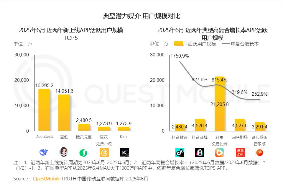 对潜力媒介的筛选有多种方式,比如通过活跃用户规模筛选新增媒介,或通过活跃用户规模复合增长率筛选具有高增长潜质的媒介。