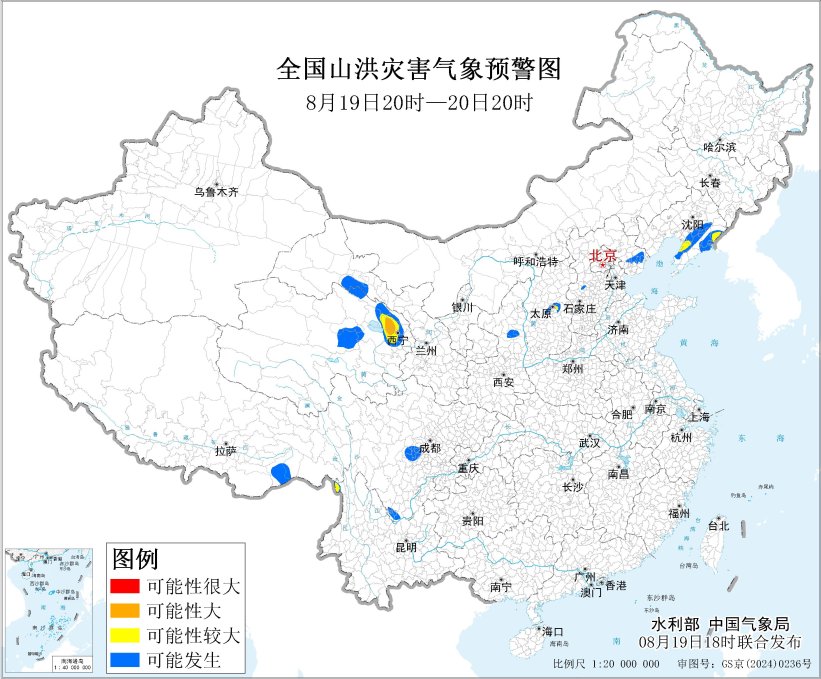 预计,8月19日20时至20日20时,山西中部、辽宁南部、云南西北部、青海东北部等地部分地区发生山洪灾害可能性较大(黄色预警),其中,青海东北部局地发生山洪灾害可能性大(橙色预警)。其他地区也可能因局地短历时强降水引发山洪灾害,请各地注意做好实时监测、防汛预警和转移避险等防范工作。