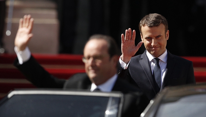 当地时间上午10时,马克龙抵达爱丽舍宫。附近居民在自家阳台上打出了“欢迎新邻居”的招牌。进入爱丽舍宫的第一个任务,就是与奥朗德举行会谈。法国媒体介绍说该会谈主要是由奥朗德向马克龙介绍国家机密、转交爱丽舍宫地堡核武器打击系统的“核弹密码”等。但本该只有半小时的会谈却被拖延到1个多小时。媒体称“二人很亲密,奥朗德似乎有说不完的话,他想以‘教练和指路人’身份在任期最后时刻给马克龙一些建议”。法国电视二台则称,看着自己曾经的顾问、部长“背叛”并“接替”自己,奥朗德当时的心情肯定很复杂。