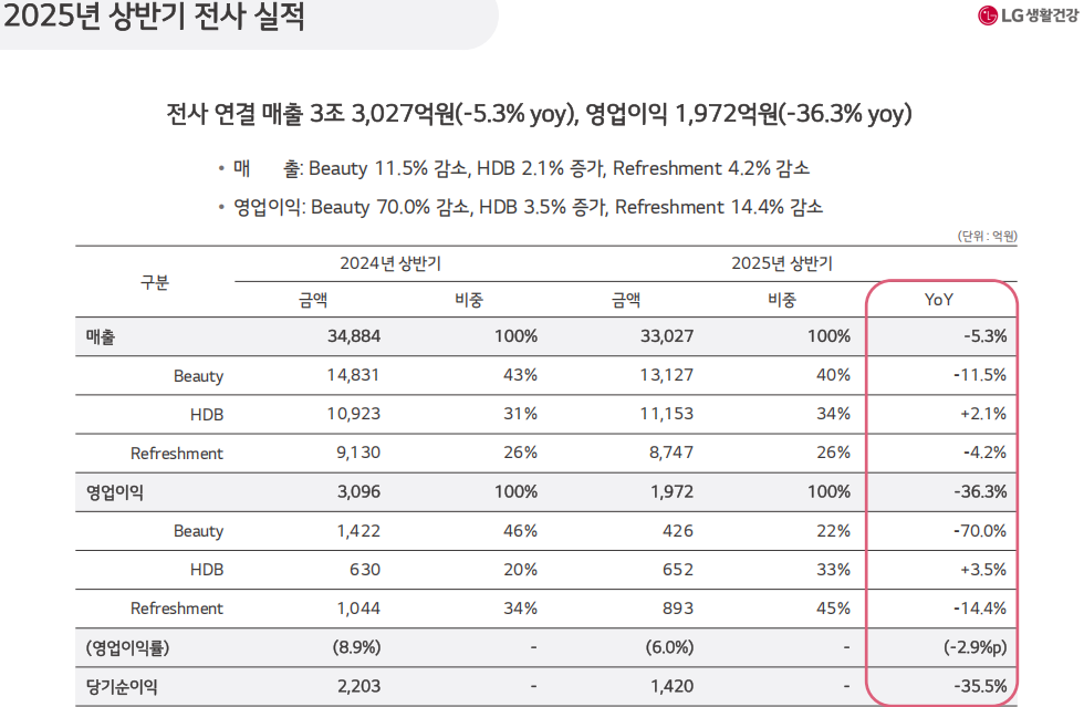日前,LG生活健康发布了2025年第二季度及上半年的财务报告。数据显示,公司在今年Q2的销售额同比下降8.8%至16029亿韩元(约合人民币83亿元),净利润同比暴跌64%至386亿韩元(约合人民币2亿元);上半年,公司的总营收实现33027亿韩元(约合人民币171亿元),同比下滑5.3%,净利润同比下滑35.5%至1420亿韩元(约合人民币7.34亿元)。