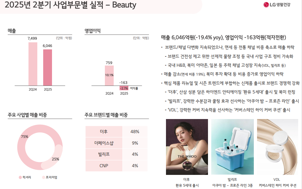 分部门来看,2025年上半年,美容部门表现并不尽如人意。该部门的营收同比减少11.5%至13127亿韩元(约合人民币68亿元),市场份额从43%进一步下滑至40%,营业利润更是直接暴跌70%至426亿韩元(约合人民币2.2亿元),而该部门在Q2的营业利润由上期盈利759亿韩元转为亏损163亿韩元(约合人民币0.84亿元)。