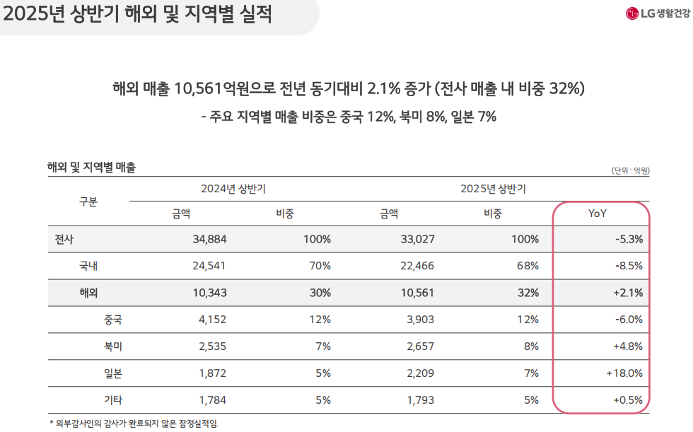 值得关注的是,在LG生活健康发布的2024年年度财报中,中国地区凭借全年销售额12.5%的双位数增长成为仅次于其他地区(14.5%)的第二大增长市场,然而,进入2025年之后,LG生活健康在中国却陷入增长颓势。