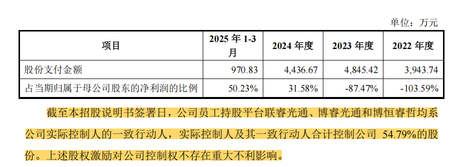除了分红,公司在股权激励方面的操作同样值得审视。近3年里,公司进行了大笔的股权激励。2022年至2025年一季度用于股份支付的费用合计1.4亿元,股份支付费用一度占到当期归母净利润的50%,甚至在公司大幅亏损的年份里支付了4000万元至5000万元的股份激励费用。而股权激励的受益人同样系公司实际控制人及一致行动人。