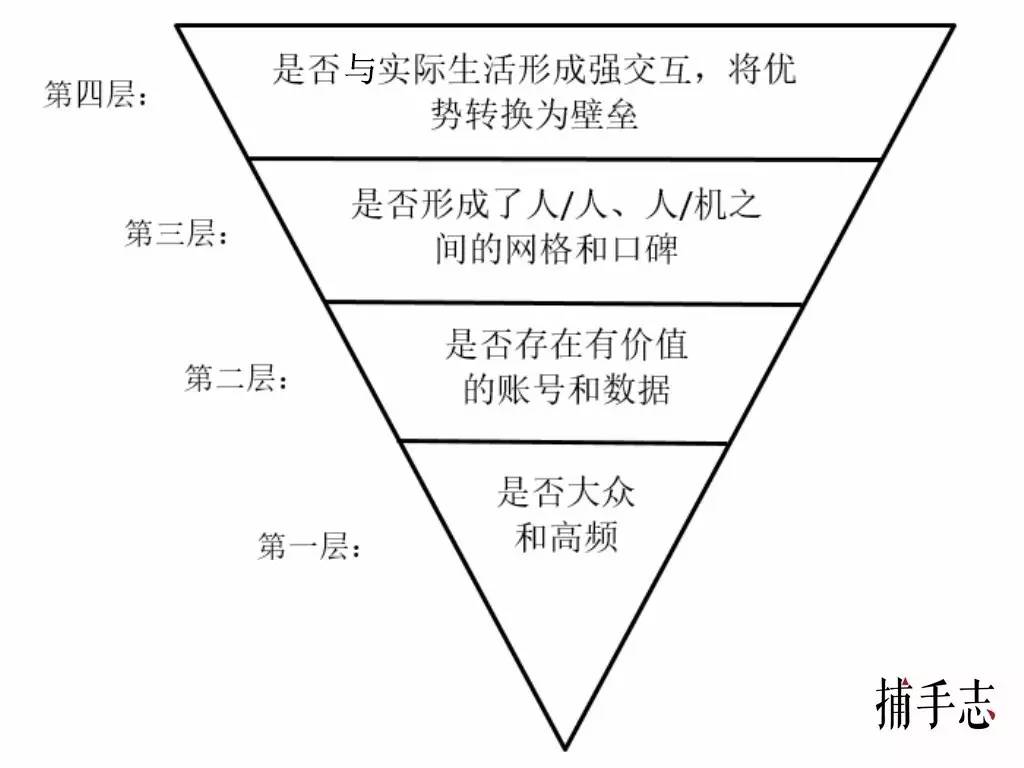 第二,正确判断产品价值和竞争优势,比如相对IM这样的产品,具体如何判断自己产品粘性的强弱。我认为按产品粘性有四个层次,从上往下越来越浅,分别为:第四层、是否与实际生活形成强交互,能够从优势转换为壁垒;第三层:是否形成了人/人、人/机之间的网格和口碑;第二层:是否存在有价值的账号和数据;第一层:是否大众和高频。