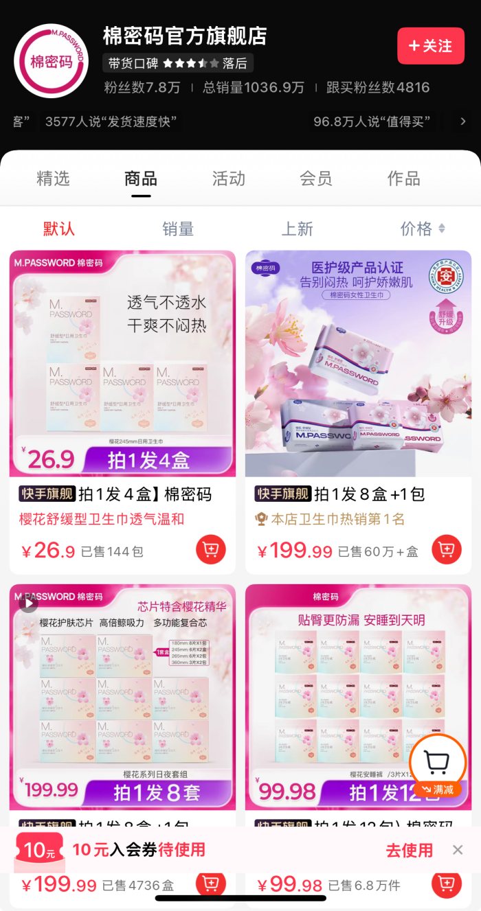 “棉密码”创立于2017年,是辛选集团旗下重要自营品牌,据称辛巴曾亲自参与研发。截至目前,辛选自营的棉密码卫生巾总销量达1036.9万。