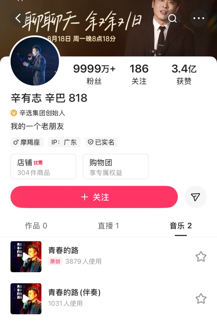 8月21日,界面新闻注意到,原头部主播辛巴在快手的核心账号“辛有志、辛巴、818”清空了所有作品,过往发布的短视频已全部删除,账号下仅留一条2024年1月的直播回放,以及两首音乐作品。截至发稿,该账号粉丝数为9999万+,获赞数达3.4亿次。