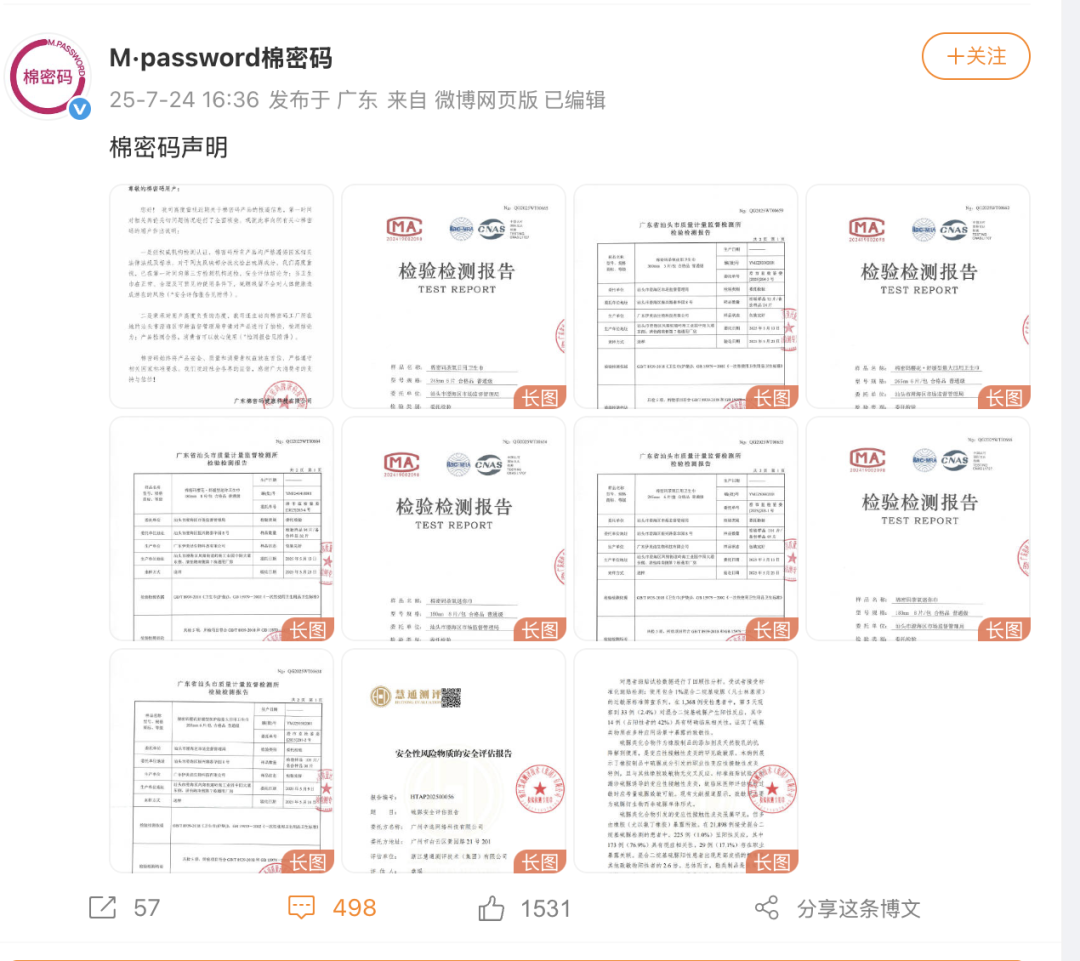 棉密码曾在7月24日发布声明,指出所有产品均严格遵循国家相关法律法规及标准。对于网友反映部分批次检出硫脲成分,其高度重视,已在第一时间向第三方检测机构送检,安全评估结论为:当卫生巾在正常、合理及可预见的使用条件下,硫脲残留不会对人体健康造成潜在的风险。
