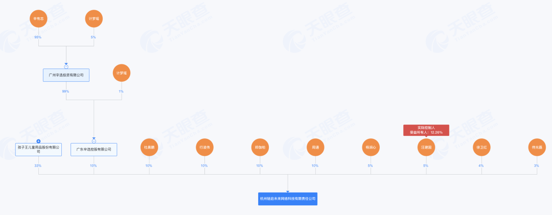 野马财经查阅发现,杨润心(蛋蛋)目前参股的只有一家杭州链启未来网络科技有限责任公司(下称“杭州链启未来”)。公司成立于2024年11月,大股东是孩子王(301078.SZ),持股比例33%,辛选控股作为二股东持股10%,杨润心在其持股5%。孩子王曾在公告中表示,设立子公司“杭州链启未来”,意在开展新家庭电商直播零售业务,并探索线下新零售业务的发展。