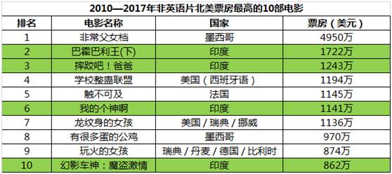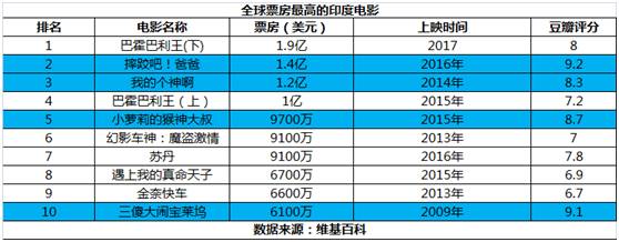 在印度电影产业的整体收入中,本土票房占比近75%,海外票房占比为7%。但是在票房的年增长速度方面,海外票房为11.5%,国内市场只有8.5%。印度电影的海外观众以邻近南亚国家居多,比如巴基斯坦、孟加拉等。但由于移民数量众多,英、澳、美、加也有不少观众。2016-2017年,在北美上映的非英语影片中,票房最高的10部电影有4部来自印度,而且排名也非常靠前。正在上映的《巴霍巴利王(下)》排名第二,且票房有望继续攀升,《摔跤吧!爸爸》则排在第三位。那中国电影呢?嗯……王家卫的《一代宗师》为我们占据了第十四名的位置。