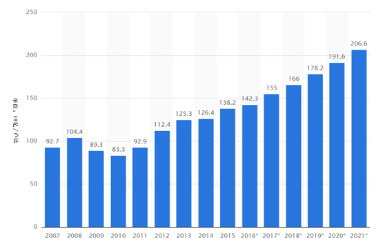 印度电影市场规模也在逐年扩大,2010年其市场规模为833亿卢比,预计今年将实现翻倍,达到1550亿卢比。2021年,则将突破2000亿卢比,达到2066亿卢比。