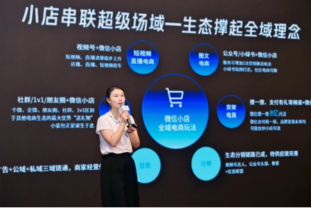 会上,微盟企服生态运营部负责人王媛媛也带来微信小店运营方法论。从功能迭代到与视频号带货的联动玩法,王媛媛深度拆解了“小店承载交易 + 小程序沉淀服务”的黄金组合如何助力企业在微信域品效销新增量。她表示,2024年微信小店带货规模高速增长再创新高,开启了电商超级场域的新纪元。微信生态正在撑起全域玩法,小店+小程序公私联营创造了品牌与用户的全链路全场景链接,内容+社交+交易,形成了微信全域电商场景图。在此背景下,微盟为商家提供了微信全域经营产品与服务,并推出了系列解决方案,助力了诸多食品快消、美妆个护等行业的头部品牌达成亮眼业绩。