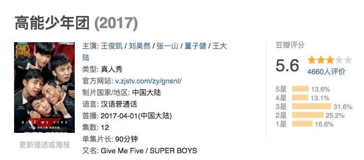 有意思的是,今年在综艺方面各家似乎都打出了美少年牌。浙江卫视的奔兄选用了鹿晗这样的IP级艺人,之后更是直接做了一档打着少年标签的《高能少年团》,将刘昊然、张一山、董子健、王大陆、王俊凯等人气男生全部集齐。但《高能少年团》首播收视便惨遭扑街,豆瓣评分仅5.6,更是被一众网友吐槽为内容空洞、剪辑混乱。