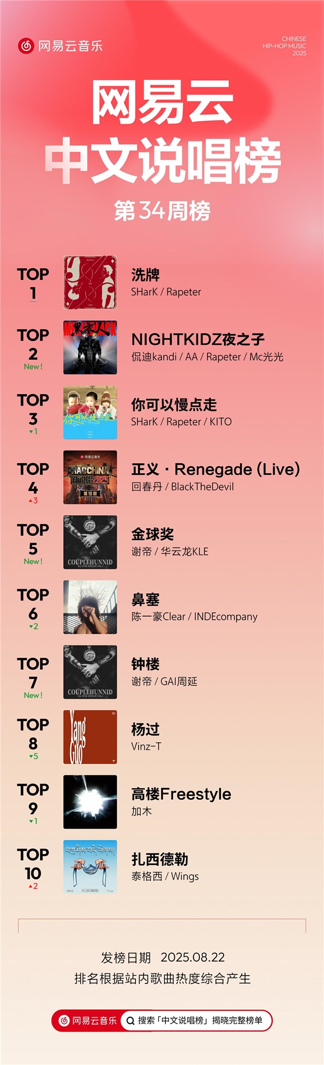 8月22日,网易云音乐发布2025年第34期说唱周榜。中文说唱榜方面,两位川渝说唱代表人物谢帝与GAI周延梦幻联动,合作单曲《钟楼》上线仅一天就跻身前十,用掷地有声的腔调传递出中文说唱最强音。谢帝全明星阵容专辑《Couple Hunnid All Star Mixtape Vol.1》也将于8月23日在网易云正式上线。该专辑与20多位当红“社区”rapper合作,如马思唯、揽佬、华云龙KLE等实力说唱音乐人。