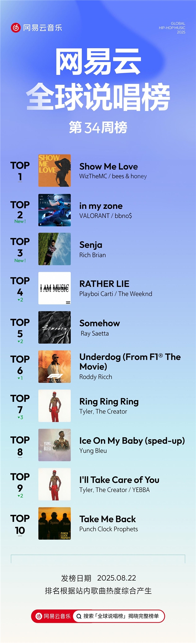 网易云说唱周榜自上线以来,持续受到广大说唱乐迷、音乐人、媒体的关注。榜单聚焦华语及全球说唱圈层,综合平台内播放、收藏、评论等数据,每周五向用户推送当周最具热度的说唱作品,涵盖“网易云中文说唱榜”和“网易云全球说唱榜”两大类别。用户在网易云音乐搜索“说唱榜”即可查看完整榜单。