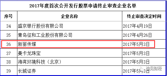 跟据证监会网站的公开监管信息,截止5月11日,2017年度首次公开发行股票申请终止审查企业共有39家企业。其中,新丽传媒赫然在列,终止审查的决定时间为5月3日。