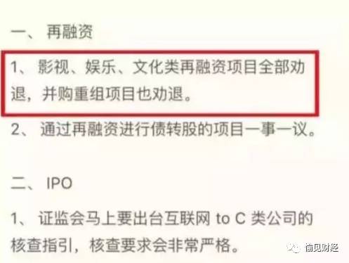 前段时间,有一份未经证实的关于再融资、IPO和公司债的监管指导意见的文本在资本圈广泛传播。该文本显示,针对影视、娱乐及文化类的定增和并购项目将被劝退,而通过再融资进行债转股的项目一事一议。 文化、传媒、游戏、影视、互联网类公司,因为稳定性不够,完全轻资产,将会受到严格监管。