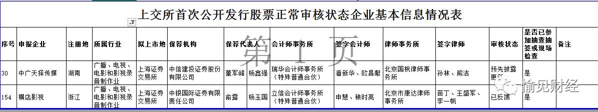 截止5月11日,根据证监会网站公布的上交所IPO正常审核状态企业基本信息情况表中显示,还有两家影视娱乐公司处于正常排队状态,分别是中广天择传媒和横店影视,分别处于第30位与第154位。其中中广天择传媒的审核状态已为“预先披露更新”。