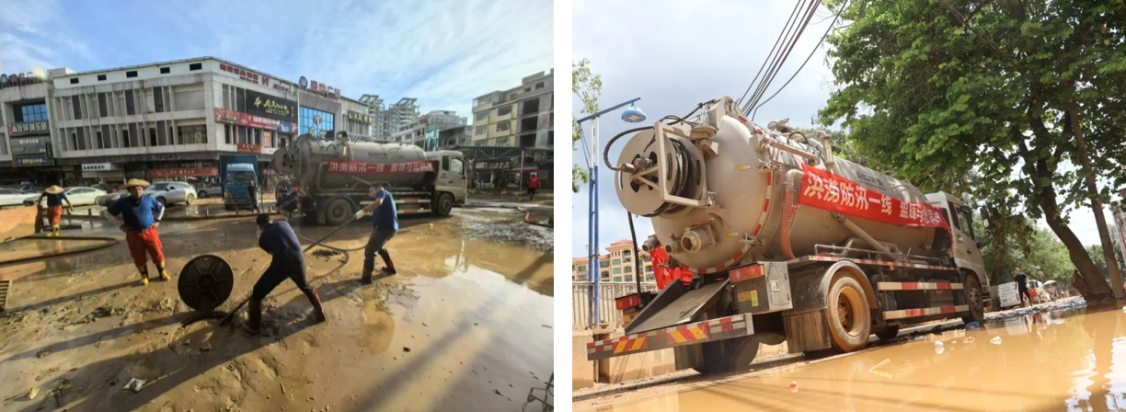 6月中旬,受台风“蝴蝶”和持续性强降雨影响,广东省肇庆市怀集县遭遇百年一遇的特大洪灾,水位突破历史极值。灾情危急之际,接到广东省三防办指令后,盈峰环境第一时间调派5台排涝装备、4台环卫装备及20余名应急救援队员,紧急奔赴受灾最严重的怀集县、广宁县,高效执行排涝、清污等任务,为打通救援通道、恢复生产生活秩序提供关键支持。