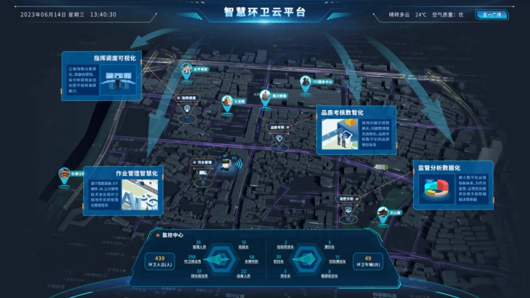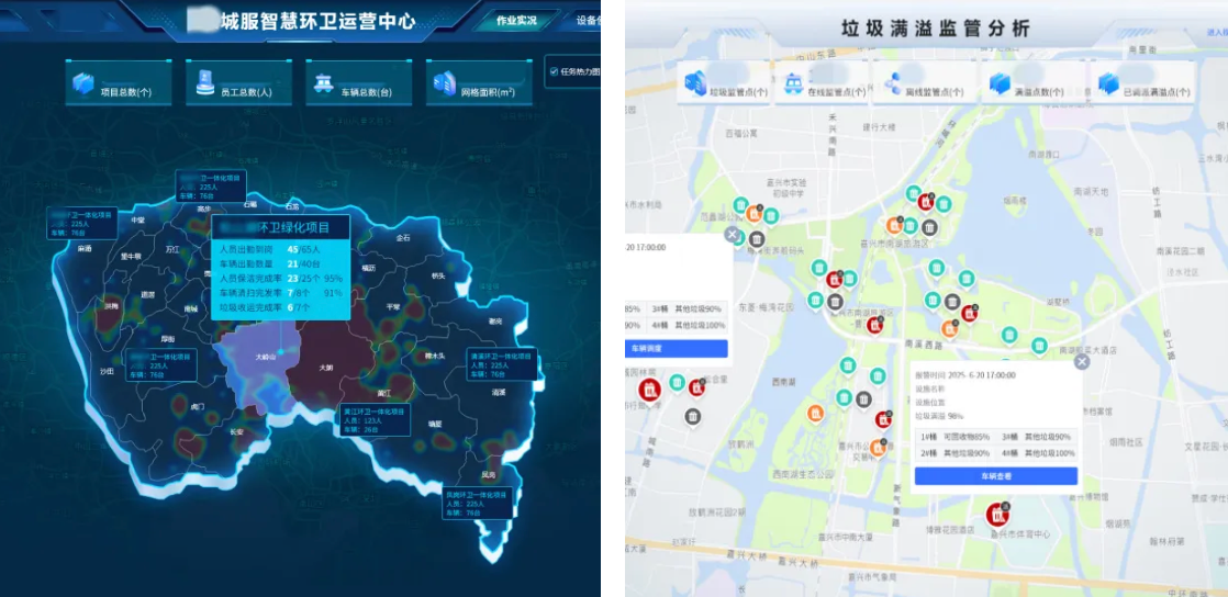 盈峰环境城市智慧清洁服务以智能装备、智云平台及掌上环卫APP为三大核心载体,通过人车物事数字化协同,建立“标准化”服务模型,实现环卫作业智能调度、实时监管、应急响应等全流程闭环管理。系统整合智能算法与多源数据,赋能城市服务精细化管理,实现智能少人、安全及低能耗智慧运营。