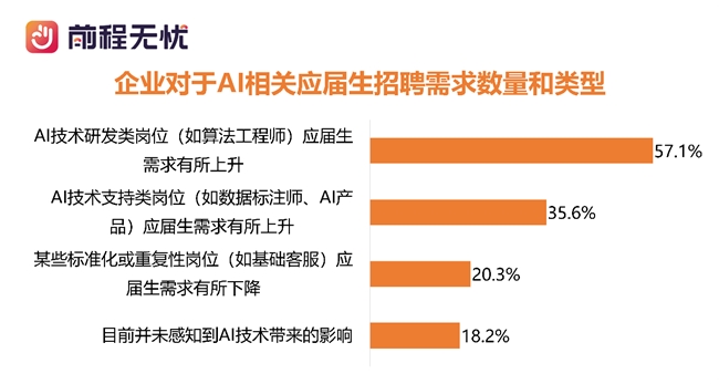 AI正在重构应届生岗位图谱,技术含金量决定需求弹性。前程无忧的调查显示,近六成企业对AI技术研发类岗位应届生需求有所增长,35.6%的企业对技术支持类岗位应届生需求有所上升,而20.3%的企业缩减基础客服等标准化或重复性岗位应届生编制。