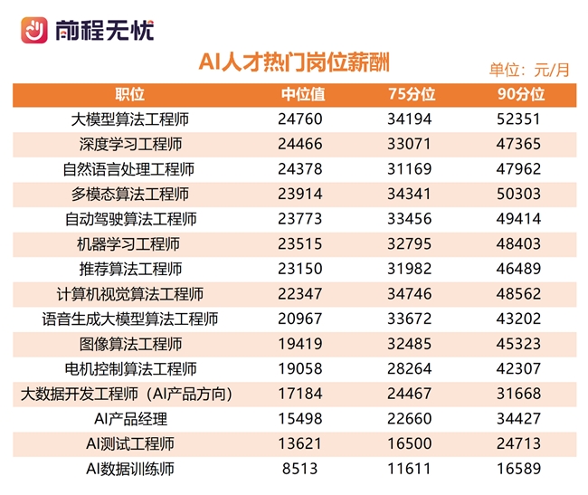 AI人才薪酬继续领跑校招市场:大模型算法工程师月薪中位数逼近2.5万