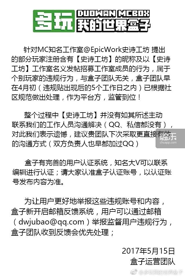 当晚,资深建筑创作团队“EpicWork史诗工坊”,也在微博发文,公开谴责多玩盒子等第三方平台,不仅长期侵权使用部分玩家和团队的原创内容,甚至在第三方社区以及公众号,以“史诗工坊”的名义进行作品发布和人员招募,他们呼吁玩家和开发者不要上当受骗。