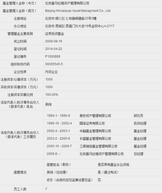根据中国基金业协会信息,该私募成立于2009年8月。吴刚是公司的法定代表人。资料显示,该私募目前旗下无产品,基金业协会信息显示,喜马拉雅2号已清盘。私募排排网同时显示,公司4只产品已清盘。