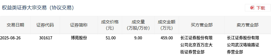 8月26日,博苑股份大宗交易成交9万股,成交额459万元,占当日总成交额的0.92%,成交价51元,较市场收盘价53.99元折价5.54%。