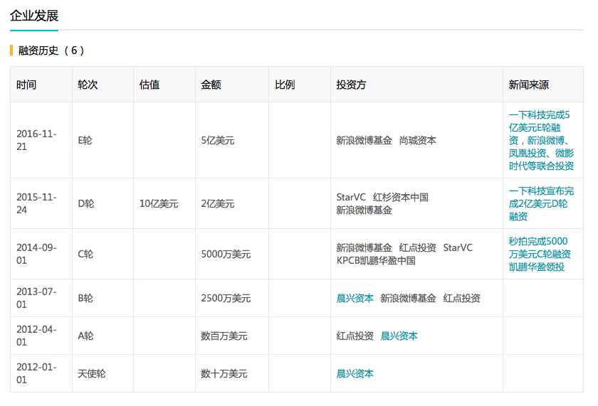去年11月21日,一下科技对外宣布完成E轮5亿美金融资,由新浪微博领投,上海广播电台、上海文化广播影视集团有限公司旗下产业投资基金等共同投资。