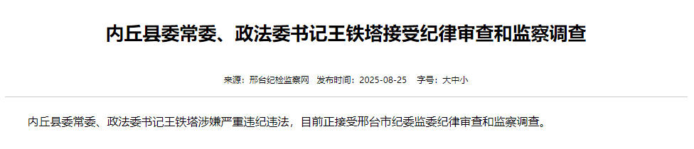 据邢台纪检监察网显示,内丘县委常委、政法委书记王铁塔涉嫌严重违纪违法,目前正接受邢台市纪委监委纪律审查和监察调查。