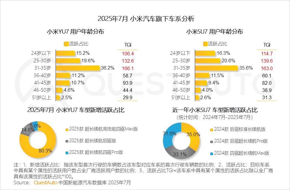 4、目前交付的小米YU7中,超80%用户选择顶配车型,其核心客群特征与小米SU7用户高度相似