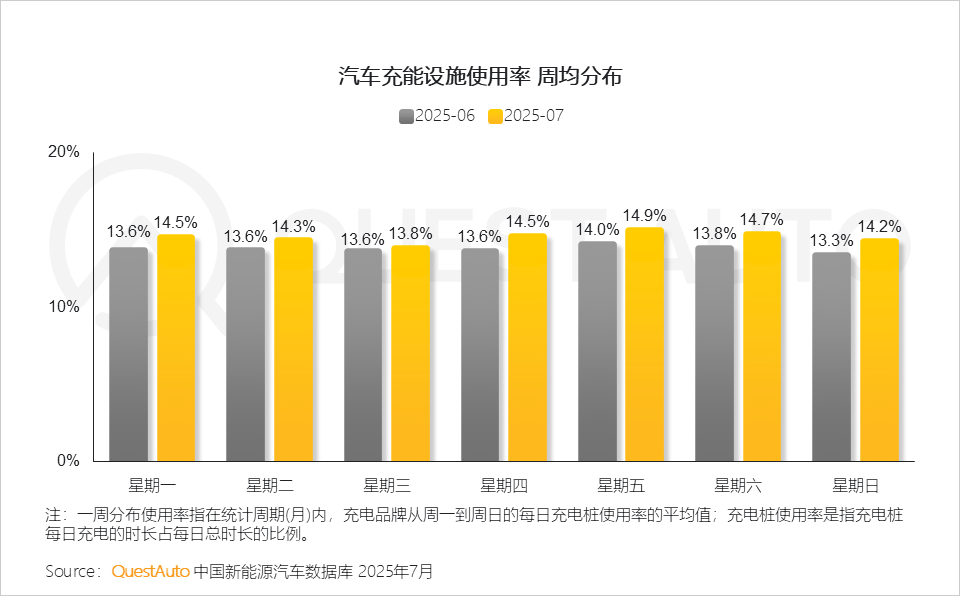 3、7月,充能设施使用率环比显著增长,其中周五、周六的充电需求更加旺盛