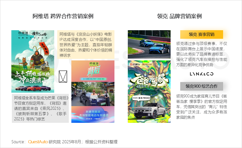 3、阿维塔锚定国漫IP与高流量综艺,以内容共鸣传递品牌精神;领克深化赛事基因并切入育儿综艺,通过场景化营销强化功能标签;各品牌基于自身定位,匹配IP与内容,实现品牌价值高效输出